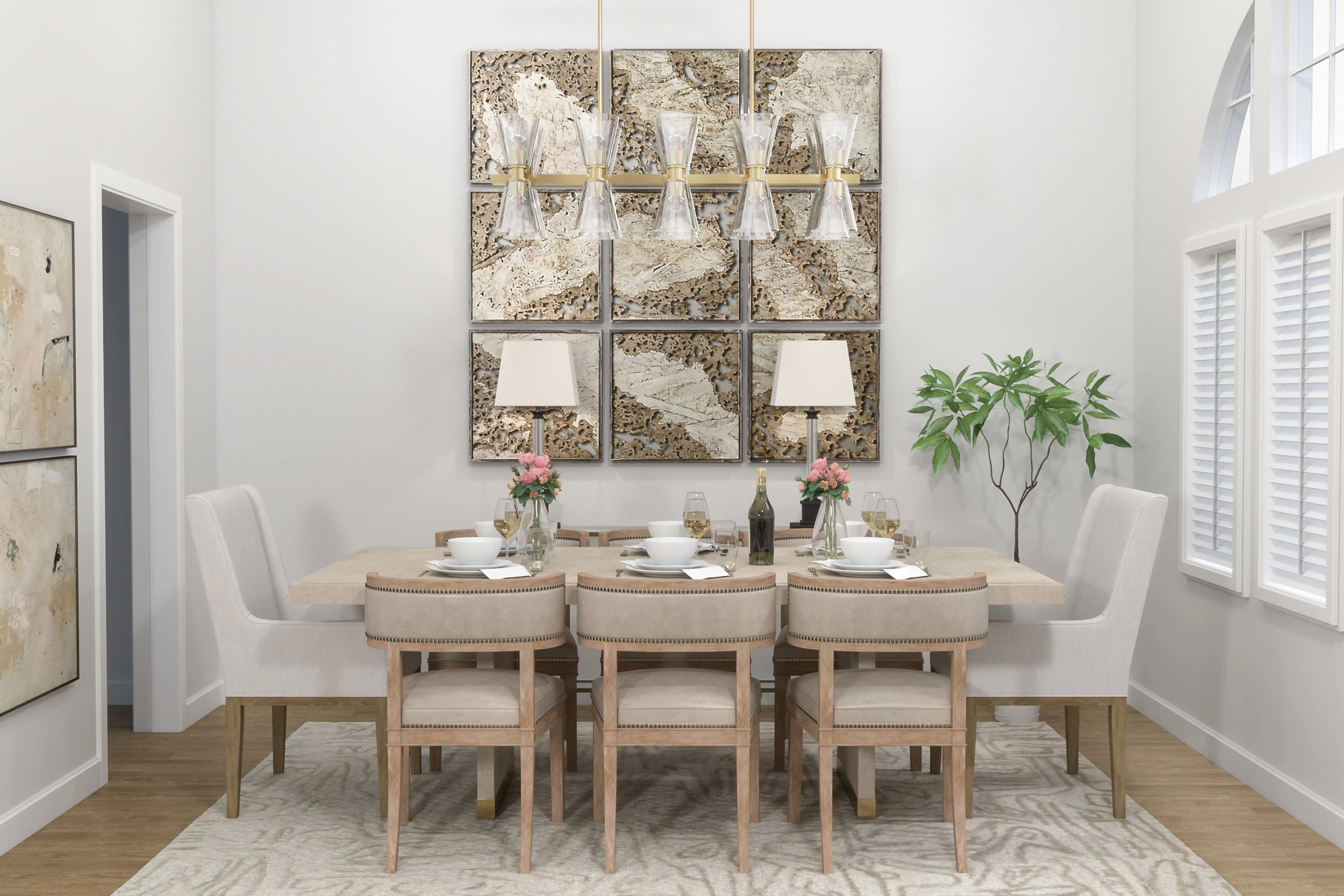 For this Dining Room, Brady selected accent tables, kitchen, and dining room tables from Uttermost and Kathy Kuo Home. Discover Furniture design inspiration on Havenly.