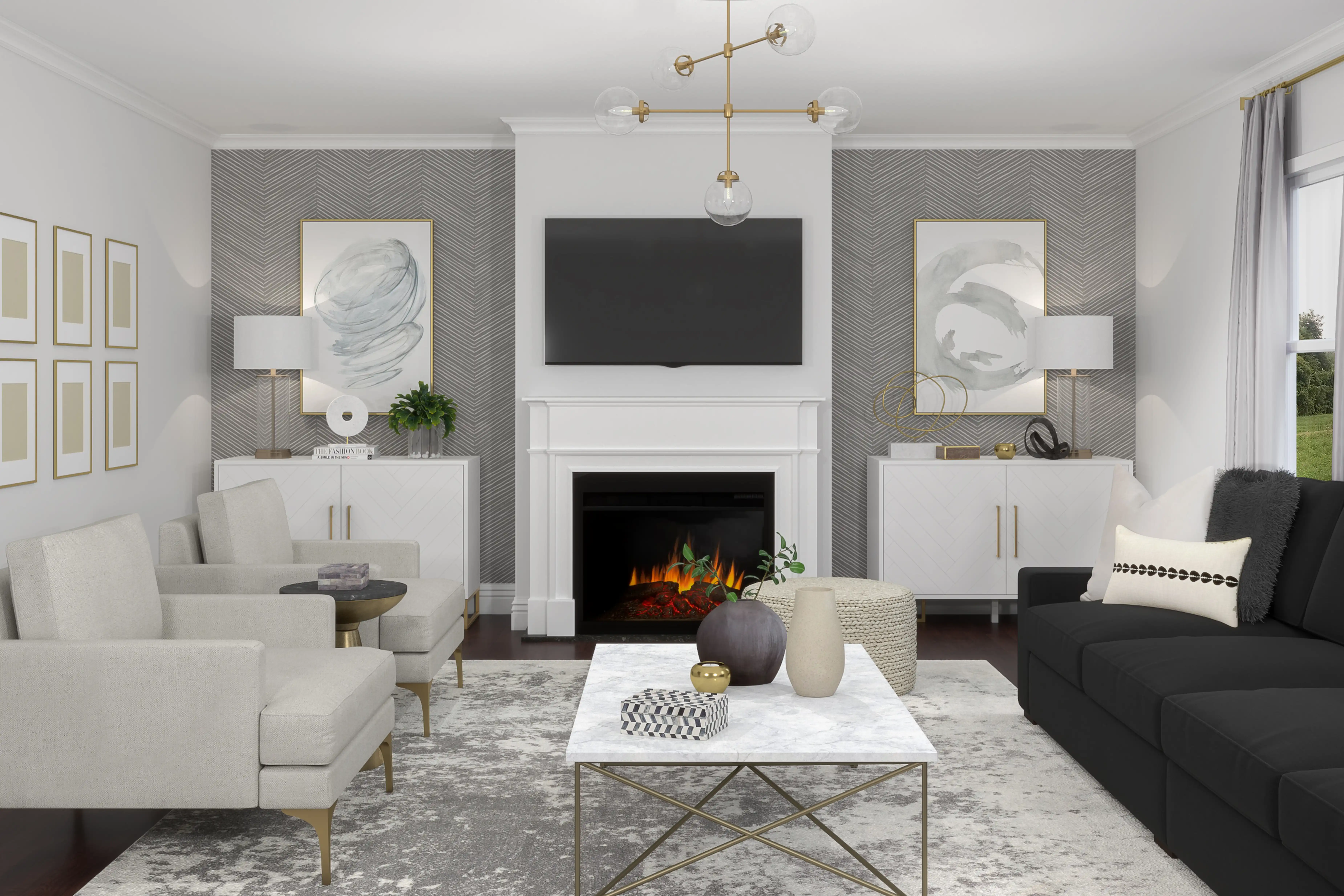 To brighten the design, Modern chandeliers and lamps were added to the room. Discover Lighting design inspiration on Havenly.