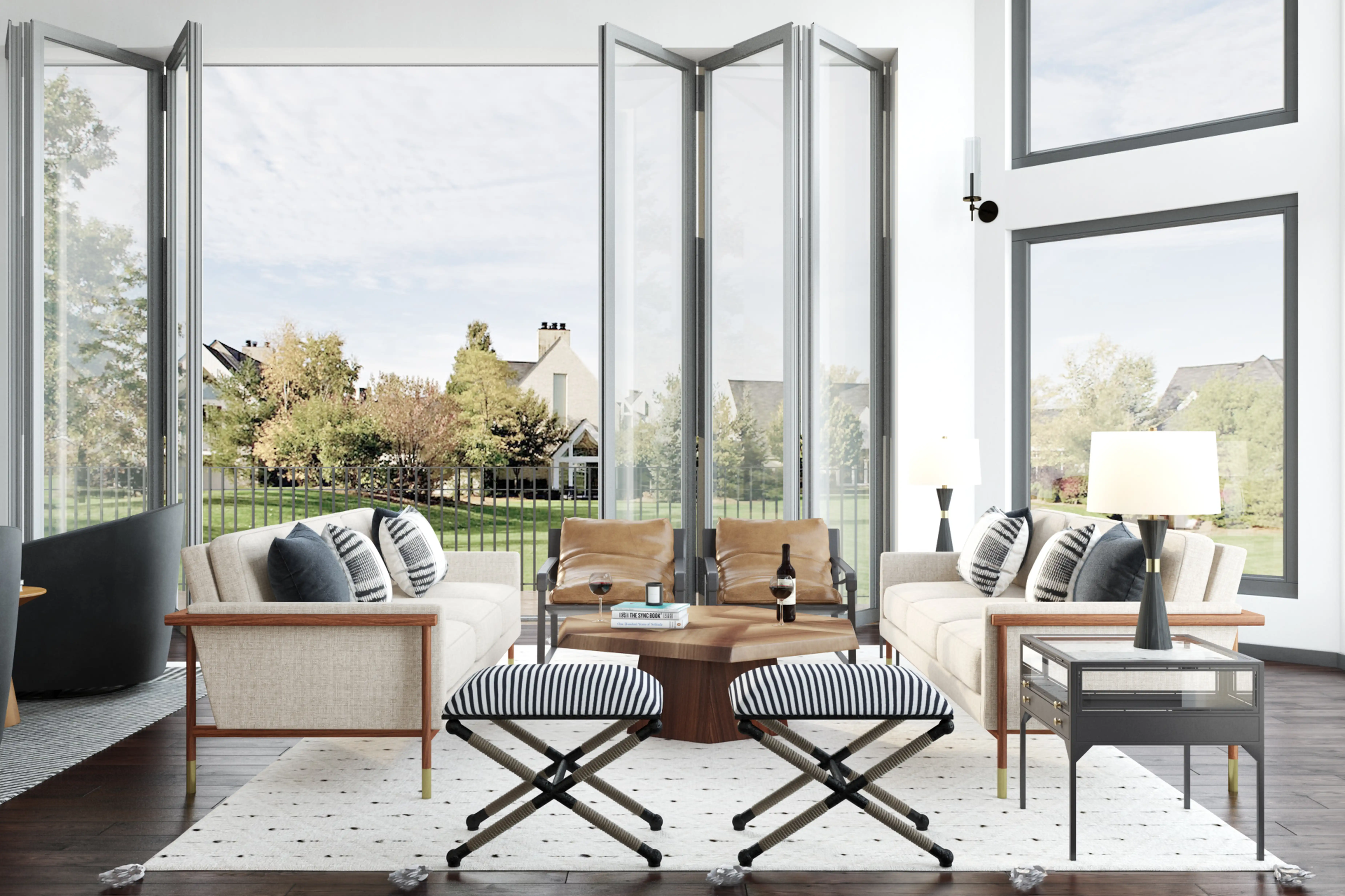 For this Living Room, Brady selected benches and coffee tables from Uttermost and Kathy Kuo Home. Discover Furniture design inspiration on Havenly.