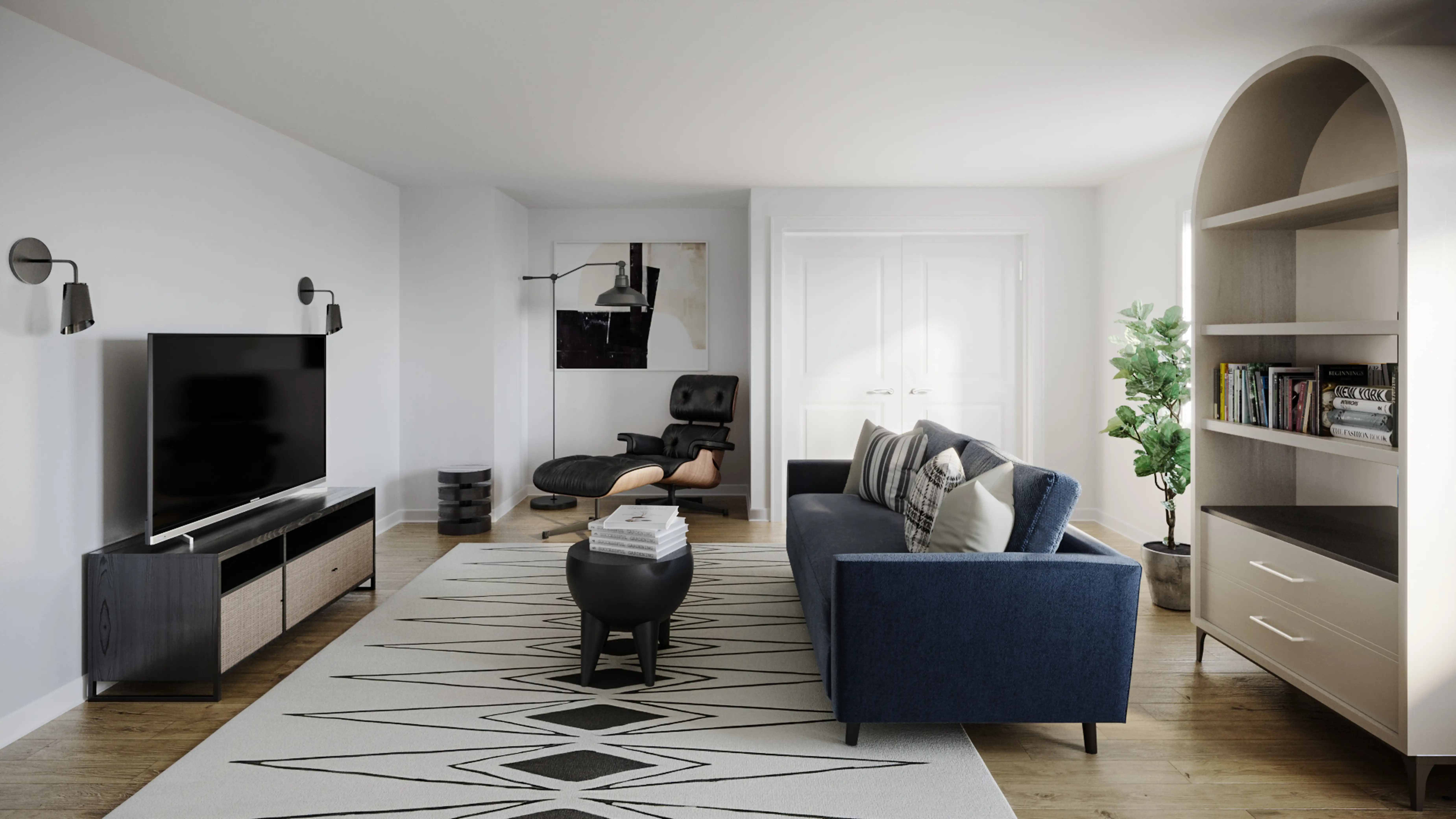 To brighten the design, Contemporary wall light fixtures and lamps were added to the room. Discover Lighting design inspiration on Havenly.