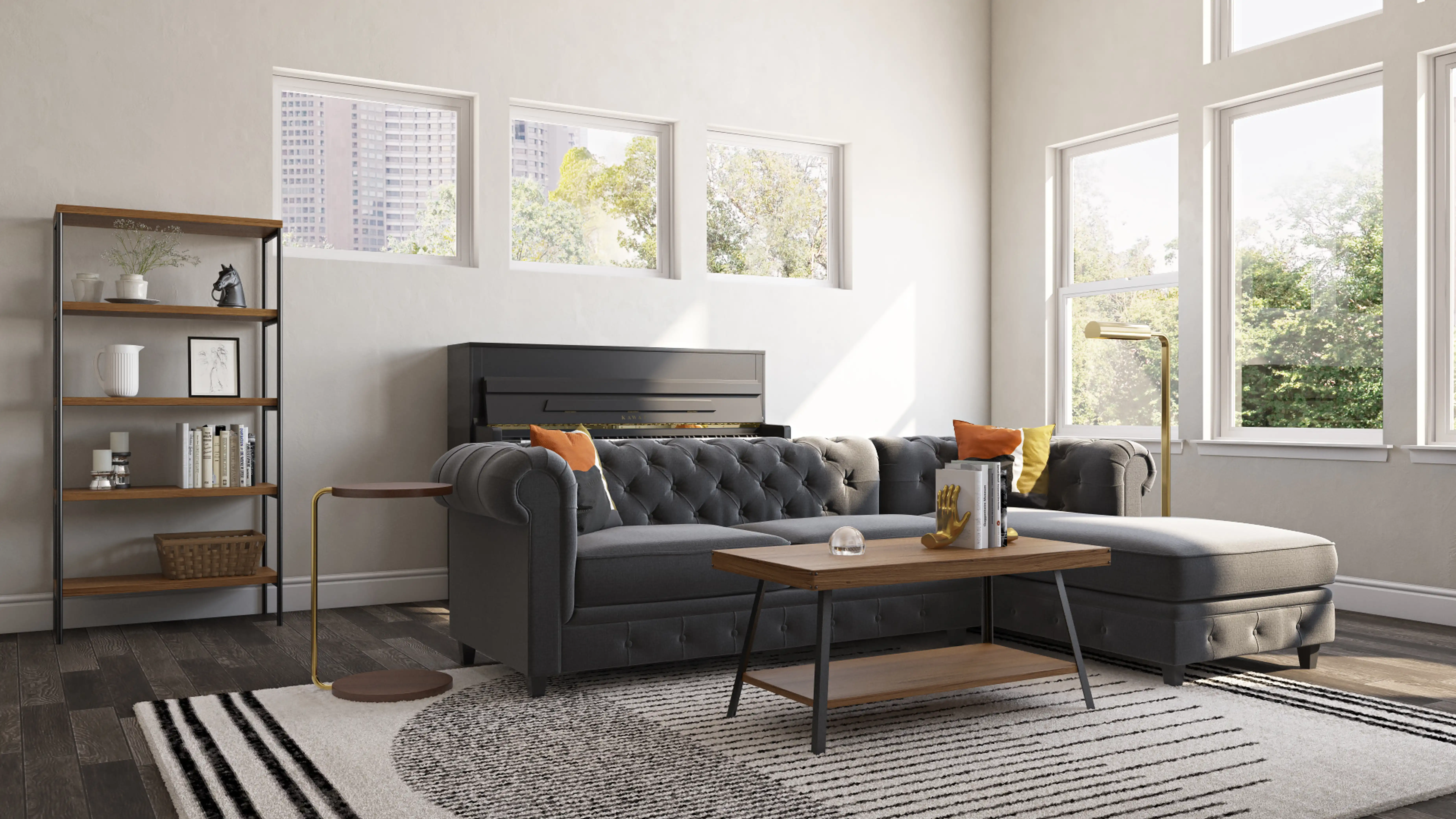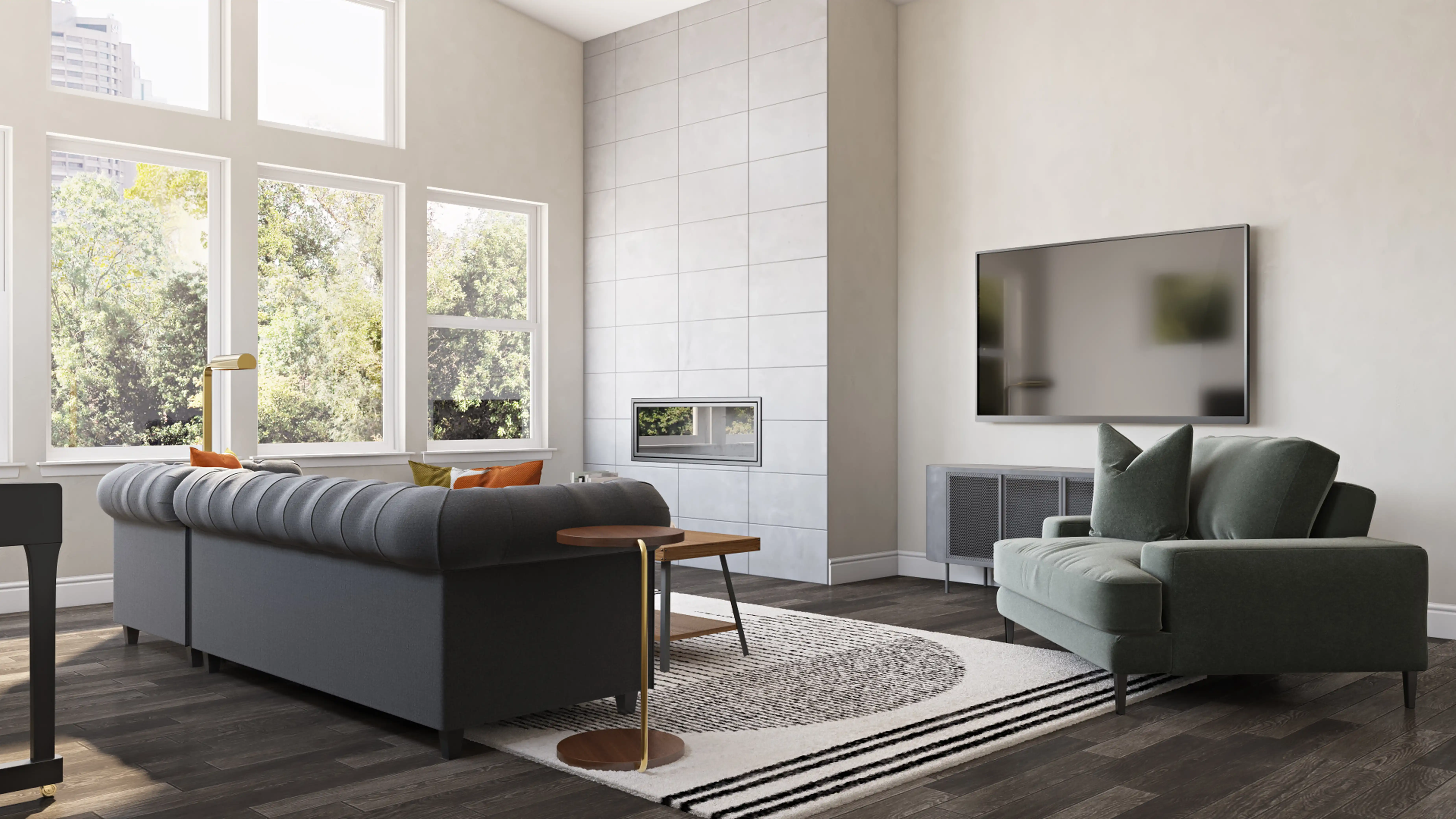 For this Living Room, Laura selected sectionals, media storage cabinets, and racks from Wayfair and Lamps Plus. Discover Furniture design inspiration on Havenly.