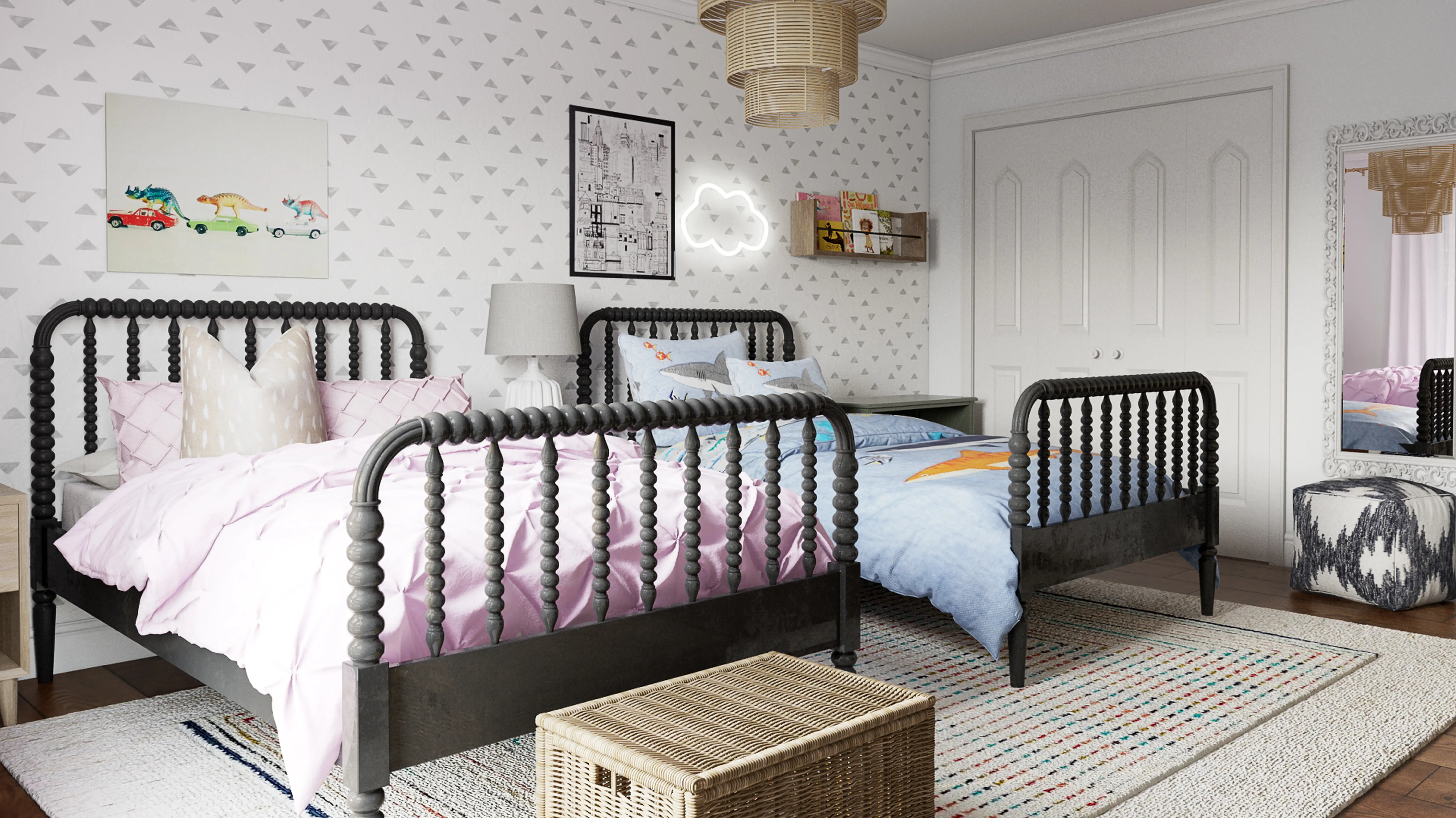 For this Bedroom, Marty selected bookcases, standing shelves, and poufs from Pottery Barn Kids and Surya. Discover Furniture design inspiration on Havenly.