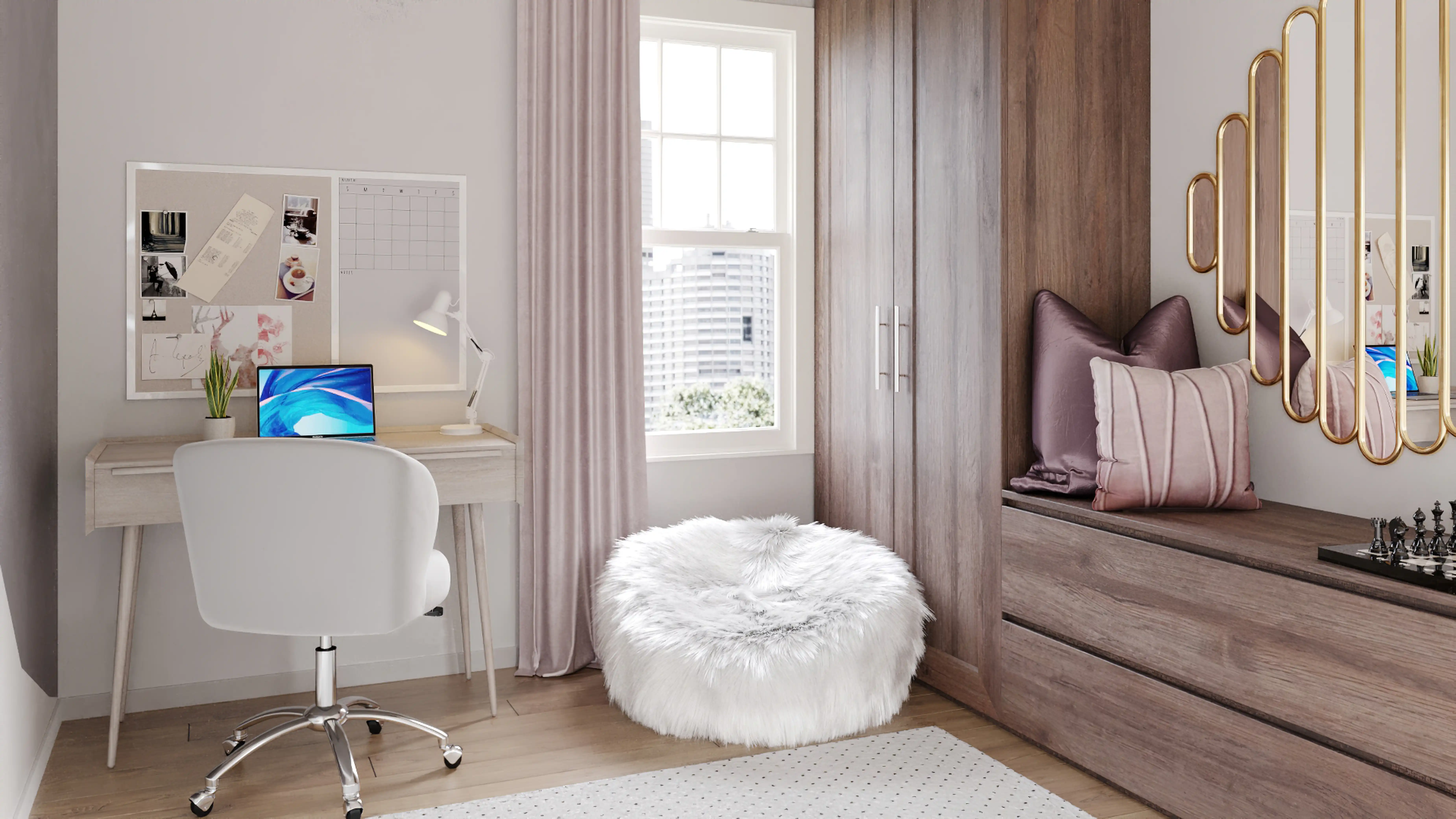 For this Bedroom, Kelsey selected end tables and office chairs from West Elm and Wayfair. Discover Furniture design inspiration on Havenly.